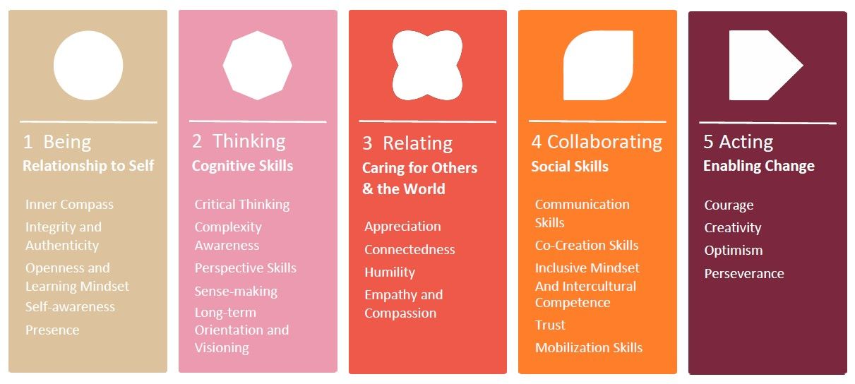 L'attuale quadro degli IDGs identifica 5 dimensioni (essere, pensare, relazionarsi, collaborare e agire) e 23 competenze (qualità), cruciali per accelerare il raggiungimento gli Obiettivi di Sviluppo Sostenibile e creare un futuro prospero per tutta l'umanità.
